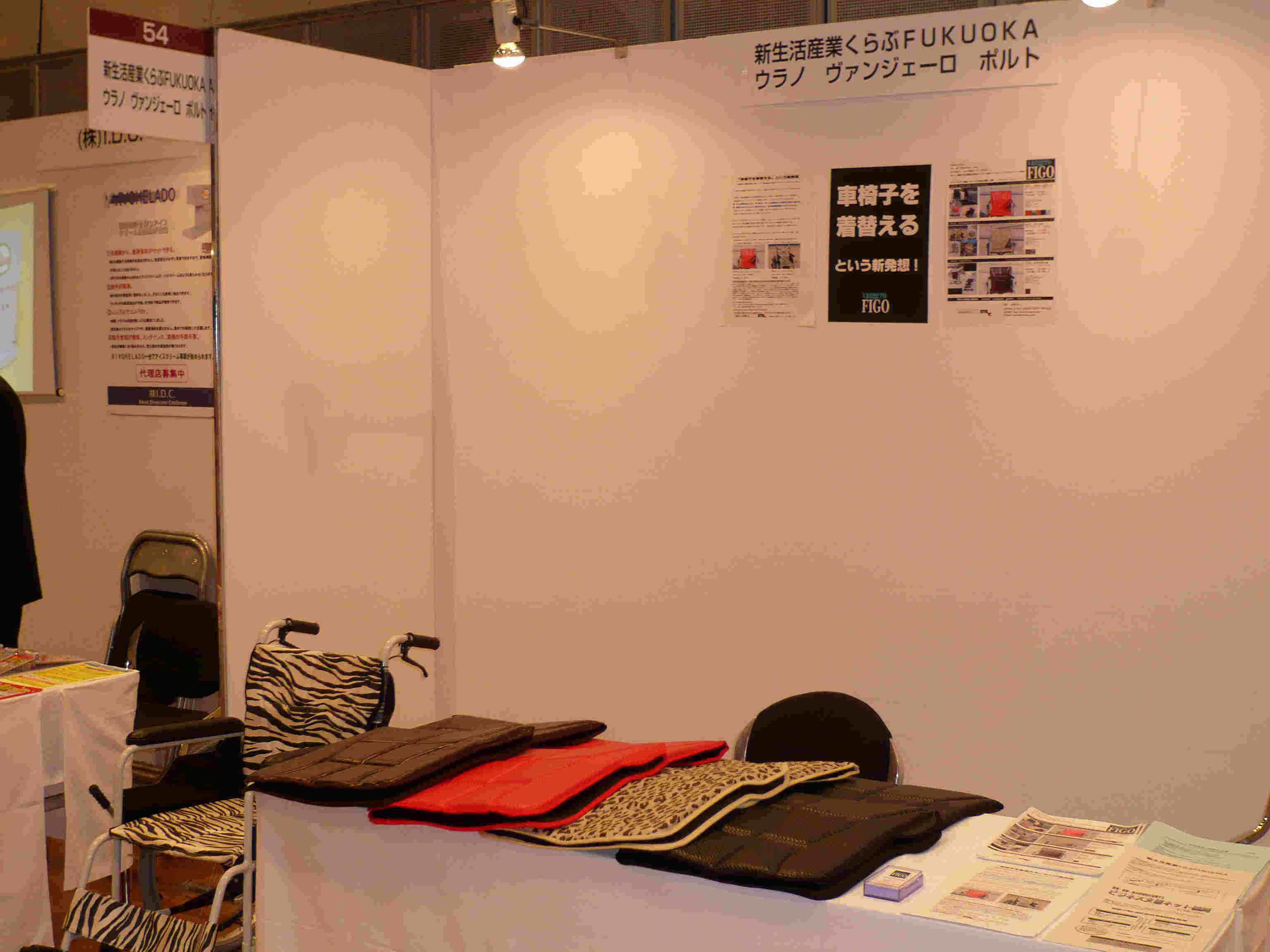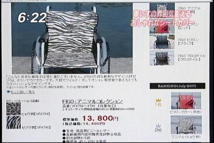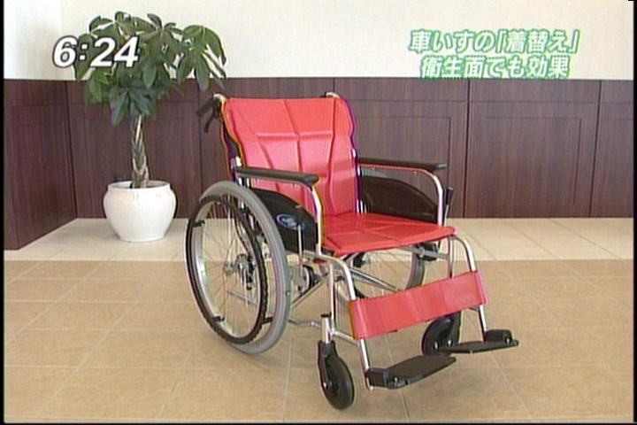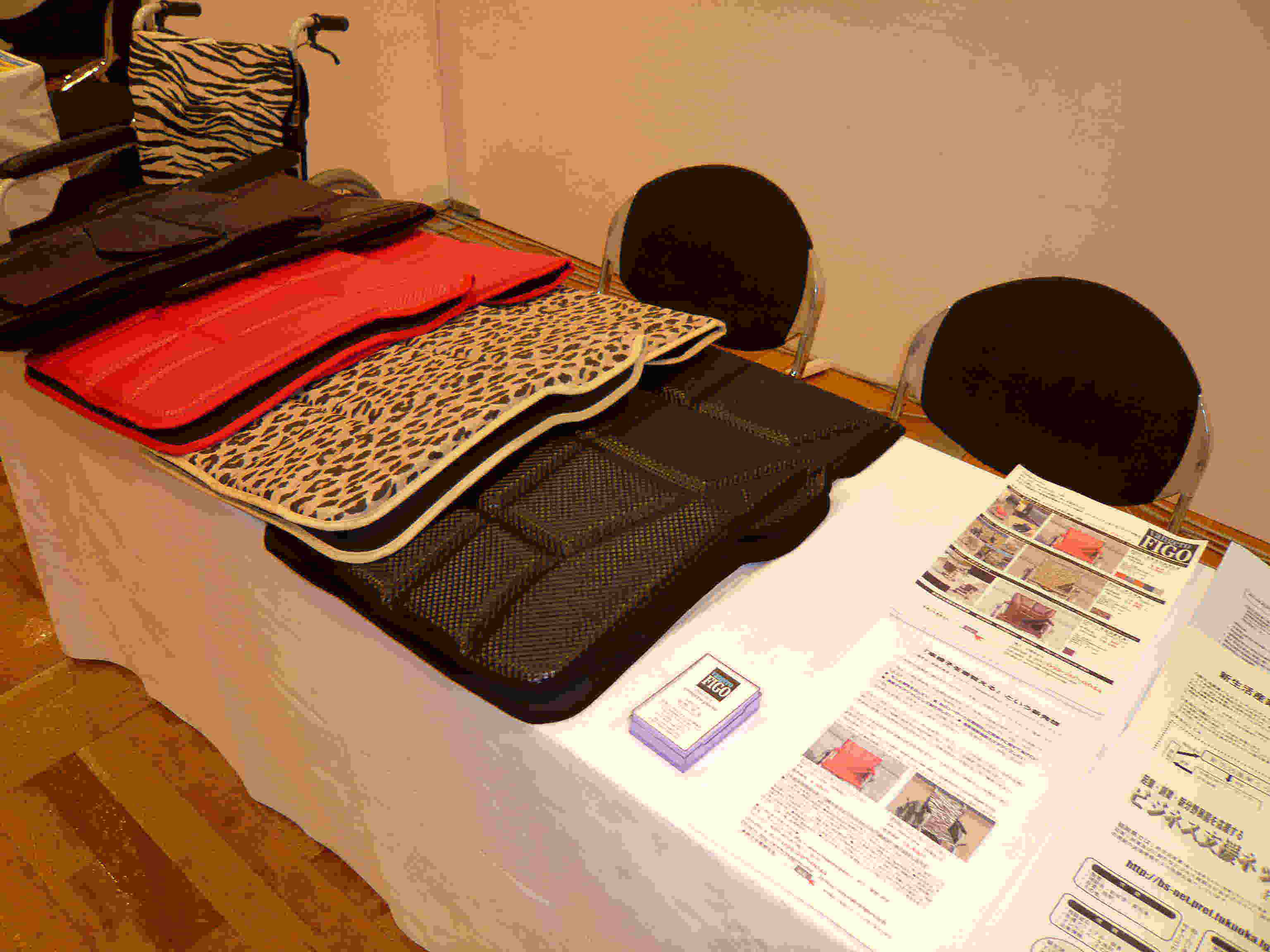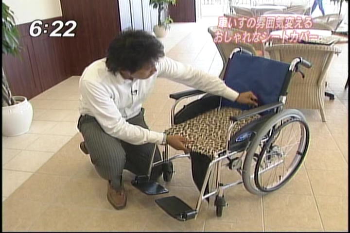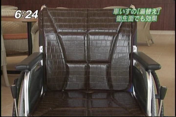 記念すべき作品第一号となったのは、クロコダイル柄のシート。既成の車椅子にかぶせてアジャスターで留めるだけで、おしゃれな車椅子に変身します。